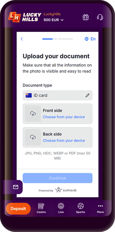 Note: upload the photos of your documents in JPEG, JFIF, PJPEG, PJP, JPG, PNG or PDF format. The size is less than 10 MB, with no glare or smudges. Check if all 4 corners and necessary info are visible. Our system doesn’t accept low-quality photos or the ones edited with a design tool.